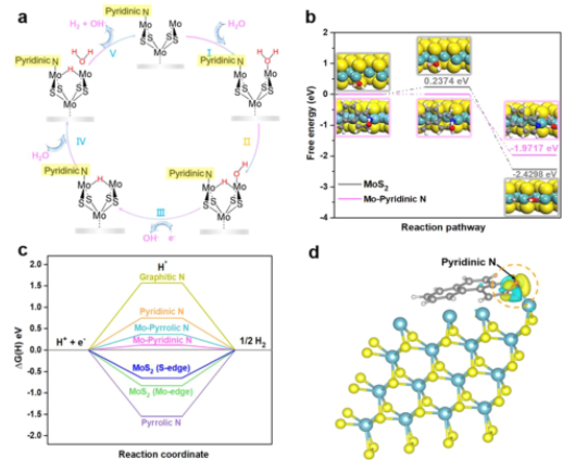 Figure 1. 基于各種反應位點的HER過程的理論研究。(a)Mo-吡啶N鍵上的堿性和中性HER機制。(b)Volmer步驟中H2O分解的能量圖。(c)計算出的各種催化劑的H吸附自由能(ΔG(H *))。(d)電荷密度差和吡啶氮的吸附示意圖。