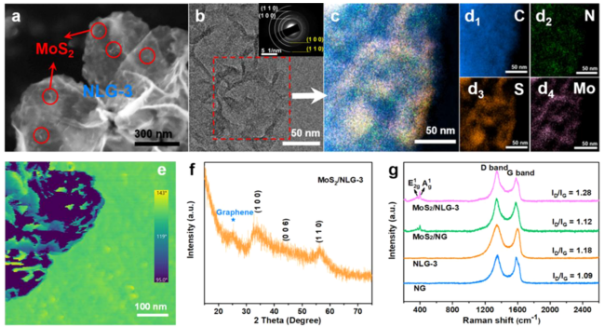 Figure 2. 催化劑的形態和結構表征。(a)SEM圖像和(b)低倍TEM圖像。(c,d1-d4)EFTEM圖像;(e)原子力顯微鏡圖像;(f)MoS2/NLG-3雜化物的XRD圖譜。(g)三種催化劑的拉曼光譜。