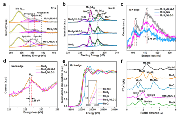 Figure 3. 界面Mo-N-C鍵的結構分析。(a)不同樣品的N 1s XPS光譜,和(b)Mo 3d XPS光譜。(c)不同樣品的的N K邊緣EELS光譜,(d)Mo M-邊緣EELS光譜,(e)Mo K-edge XANES光譜,(f)FT-EXAFS光譜。