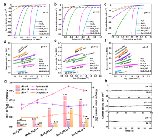Figure 4. 在不同pH電解質中HER的活性和穩定性。在N2飽和的(a)0.5 M H2SO4,(b)1.0 M KOH和(c)1.0 M PBS電解液中的LSV極化曲線。(d-f)雜化催化劑的相應Tafel斜率。(g)TOF與吡啶,吡咯和石墨氮含量之間的關系。(h)MoS2/NLG-3樣品在酸、堿、中性溶液中的HER穩定性(i-t曲線)。