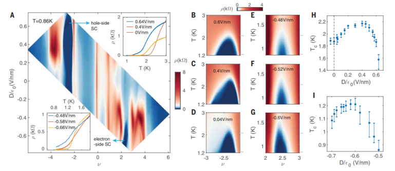 相關研究成果于2021年由哈佛大學Philip Kim課題組,發表在Science(DOI:10.1126/science.abg0399)上。原文:Electric field–tunable superconductivity in alternating-twist magic-angle trilayer graphene。