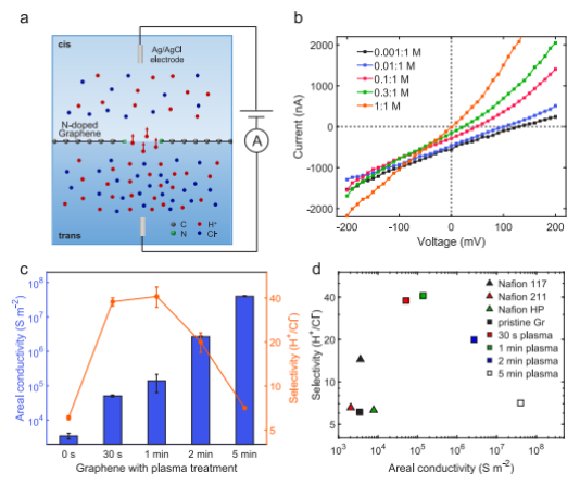 Figure 1. 通過NGM的離子和分子運輸。(a)NGM的構造,通過N2等離子體處理引入N摻雜。(b)實驗設置。(c)不同膜的質子傳導率(1 M HCl)和甲醇滲透率。(d)HCl對甲醇的選擇性和質子傳導率。