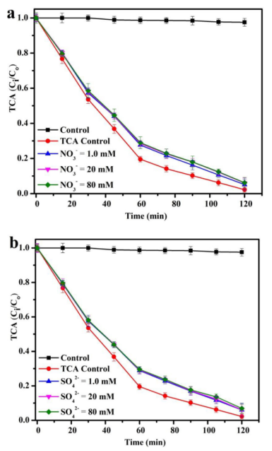 Figure 3. 溶液基質對TCA降解的影響:a)HCO