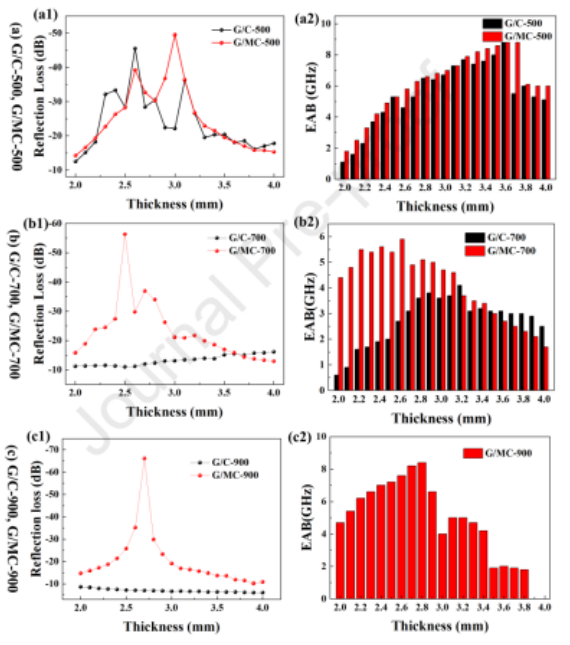 Figure 3.G/C和G/MC復合材料RL值(左圖)和有效吸收帶寬值(右圖)。
