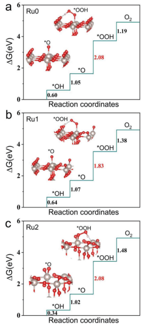Figure 5. 在a)Ru0,b)Ru1和c)Ru2位置上計算的OER自由能分布。