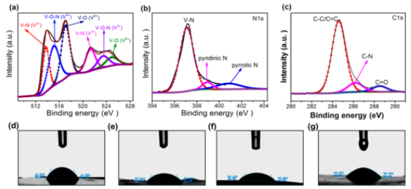 圖2. VN@N-rGO多功能層的表征和接觸角。VN@N-rGO多功能層的(a)V2p,(b)N1s和(c)C1s光譜。(d)原始PP、(e)VN/PP分離器、(f)N-rGO/PP和(g)VN@N-rGO/PP的接觸角,使用靜態電解質液滴分離器。
