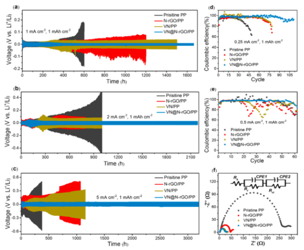 -2下,使用了VN@N-rGO/PP隔膜的鋰電池,即使在2500小時以上仍能很好地工作,表現出超高的循環穩定性。本文提出了一種適合于無枝晶超穩鋰基電池的三維多孔多功能中間層的合理設計思想和制造策略。