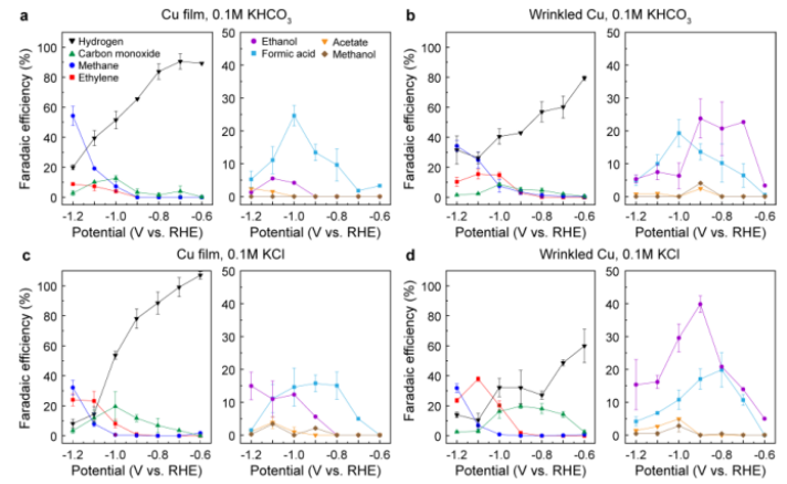2轉(zhuǎn)化趨勢。使用(c)電拋光銅膜和(d)褶皺銅膜,在0.1 M KCl電解質(zhì)中的法拉第效率和不同的電位的結(jié)果