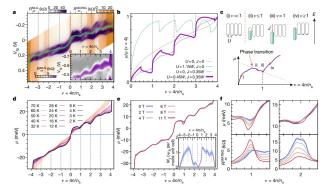 相互作用驅動的自發對稱破壞是物質許多量子相的核心。在moiré系統中,平坦帶中破缺的旋轉/山谷“favour’”對稱構成了父態,相關基態和拓撲基態,最終由此產生。然而,這種有利于對稱破缺的微觀機制及其與低溫相的聯系尚不清楚。在這里,該文同時進行熱力學和輸運測量,研究了魔角扭曲雙層石墨烯(MATBG)的破缺對稱多體基態及其非平凡拓撲。直接觀察到了摩爾對稱性破缺是moiré超晶格所有整數填充物上化學勢的釘扎固定引起的,這證明了Flavour Hund耦合在多體基態中的重要性。打破時間反轉對稱破缺的情況下,基本平面帶的拓撲性質得以體現,分別在1、2、3處測量了Chern數為3,2,1的Chern絕緣子態對應的能隙,這與MATBG的Hofstadter 蝴蝶光譜的味對稱破損是一致的。此外,電阻率和化學勢的同步測量提供了奇異金屬狀態下MATBG 隨溫度變化的電荷擴散率——以前只有在超冷原子中才發現過該數量。該研究結果使人們更趨近于一個統一的框架,以了解具有或不具有磁場的MATBG拓撲帶中的相互作用。