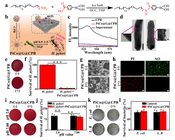 Fig. 2 C18-PEGn-苯硼酸(CPB)的合成和PtCo@G@CPB體外選擇性治療幽門螺桿菌。
