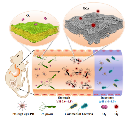 幽門螺桿菌感染是胃病的主要病因。然而,幽門螺桿菌的臨床抗生素治療因其對共生菌的療效和副作用不斷降低而受到限制。在此,我們開發了一種體內可活化的pH-響應型石墨納米酶PtCo@石墨烯(PtCo@G),用于選擇性治療幽門螺旋桿菌。這樣的納米酶可以抵抗胃酸腐蝕,顯示出類似氧化酶的活性以僅在酸性胃環境中穩定地產生活性氧,并表現出優異的選擇性殺菌性能。C18-PEGn-苯硼酸分子在PtCo@G上修飾,提高了其靶向能力。在酸性胃液pH下,石墨納米酶對幽門螺桿菌顯示出顯著的殺菌活性,而在腸道條件下未觀察到細菌殺滅作用。在小鼠模型中,對幽門螺桿菌具有較強的抑菌能力,對正常組織和共生細菌的副作用很小。石墨納米酶在相應的生理部位顯示出所需的酶樣活性,可能解決臨床治療幽門螺桿菌感染的關鍵問題。