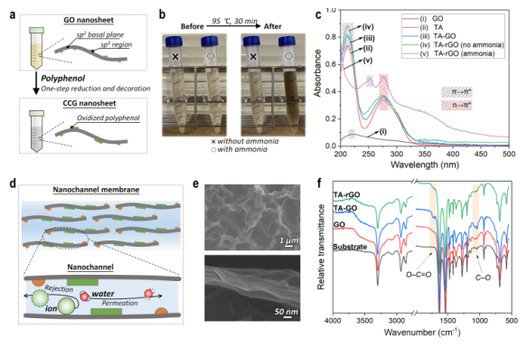 Figure 1.(a)CCG納米片的合成示意圖和CCG納米通道膜中水/離子傳輸的示意圖。(b)數碼照片。(c)不同樣品的懸浮水溶液的紫外可見光譜。(d)納米通道膜中水/離子遷移的圖示。(e)TA-rGO膜的表面和橫截面SEM圖像。(f)不同膜的ATR-FTIR光譜。