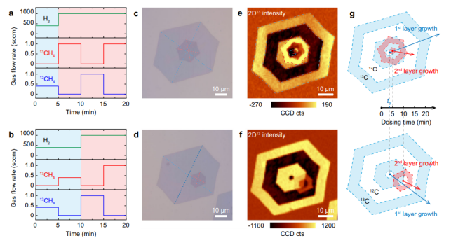 Fig. 2 異位成核和tBLGs的生長過程,通過同位素標記結合顯微拉曼光譜法進行可視化。