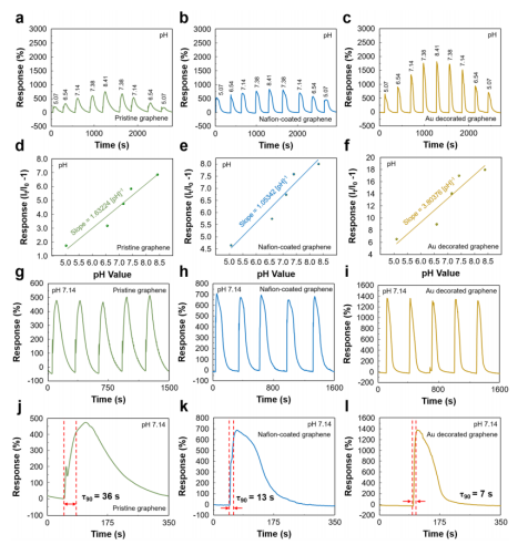 液體中離子和分子的檢測已為實現電子(智)舌受到了廣泛的關注。具有高靈敏度的溶液門控場效應晶體管(SFETs),可通過讀取電導來檢測出離子和分子。但是,迄今為止,采用SFETs的離子傳感器和分子傳感器具有局限性,例如缺乏動態開關功能且選擇性低。在本項研究中,作者評估了合理設計的石墨烯SFETs作為pH和葡萄糖選擇性傳感器。通過控制溶液的注入和抽出,微流體通道與石墨烯SFET集成,表現出動態的開關功能。當分別用Nafion作為分子篩和Au裝飾的納米顆粒作為受體時,石墨烯SFET裝置顯示出高pH和葡萄糖選擇性。采用定制石墨烯通道的SFETs具有動態開關功能和高選擇性,通過將單獨的SFETs集成可同時傳感多個目標陣列,具有發展為電子舌平臺的巨大潛力。