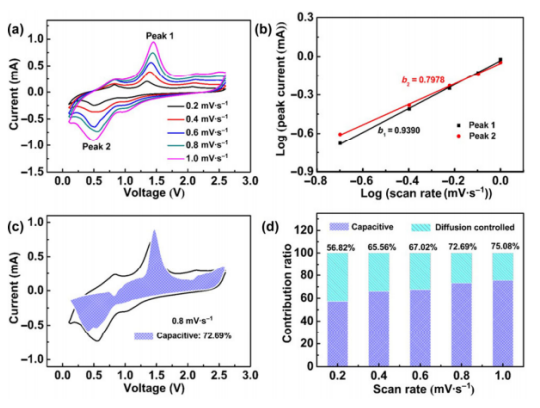 Figure 4 (a)不同掃描速率下的CV曲線(xiàn)。(b) log(i)和log(v)的線(xiàn)性關(guān)系。(c)掃描速率為0.8 mV·s-1時(shí)CV剖面的電容貢獻(xiàn)(紫色區(qū)域)。(d)不同掃描速率下贗電容貢獻(xiàn)率。