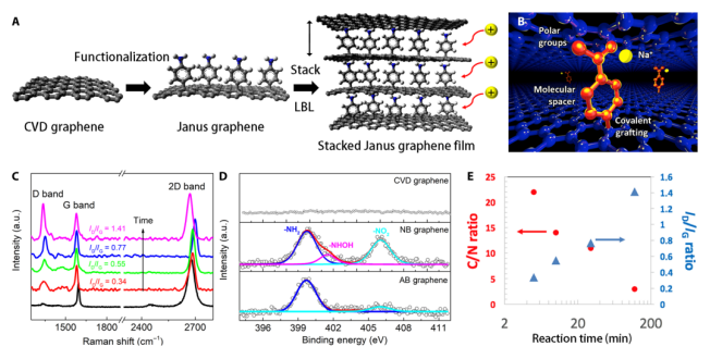 +存儲的納米石墨狀負極極,由僅在一側功能化的堆疊石墨烯片形成,稱為 Janus石墨烯。不對稱功能化使得Na
