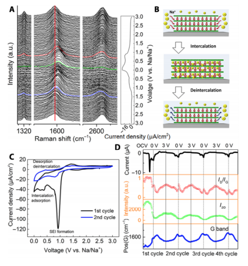 +可以可逆插入,還可以通過操作拉曼光譜電化學和成像橢偏儀進行監測。該Janus石墨烯具有均勻的孔徑、可控的功能化密度和較少的邊緣,其儲存Na