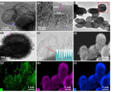 Figure 2.(a-d)Ni5P4 和Ni5P4@FG樣品的低分辨率和高分辨率 TEM 圖像,(f-i)Ni5P4@FG的STEM 圖像, C、Ni和 P 元素的 EDX 元素分布圖。