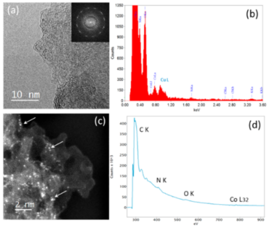 Figure 2. (a) Coqpy@GA的HR-TEM顯微圖(插圖為FFT)。(b)樣品的EDXS數據,其中碳、氮、氧和鈷被觀察到,而氯不存在(Si和K被發現為雜質,Cu來自TEM網格)。(c) 樣品的薄片區域的原子尺度的HAADF-STEM圖像,其中單個Co原子(可能是氧原子)被觀察為亮點(箭頭表示Co原子可能的位置)。(d)存在C K-、N K-、O K-和Co L邊的EELS譜。