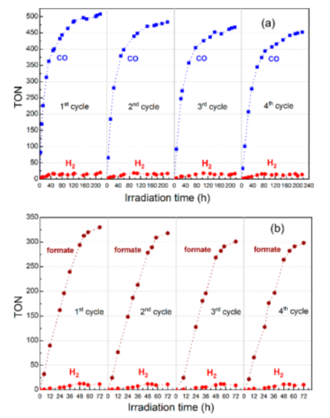 Figure 4.在可見光照射下分別在(a) ACN + 0.1 M PhOH和(b) ACN + 1.51 M TEOA中Coqpy@GA雜化物連續循環催化CO2還原。