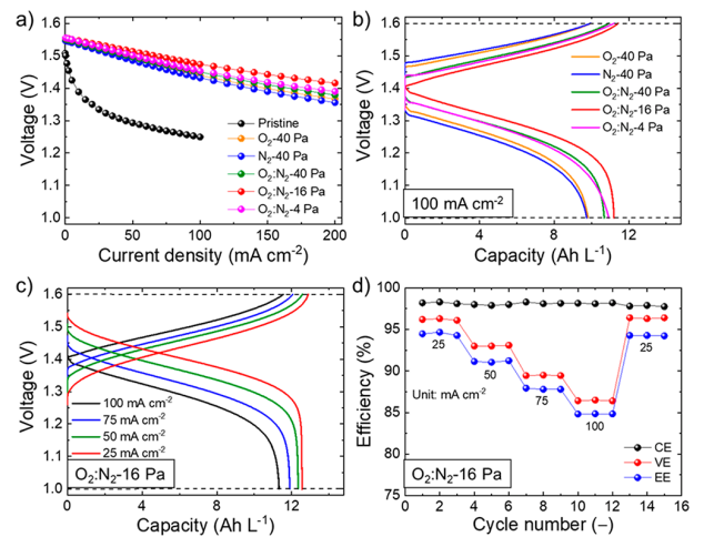 Figure 4. 使用Nafion 115作為質(zhì)子交換膜,基于等離子體處理GFs的VRFBs的電化學(xué)性能。