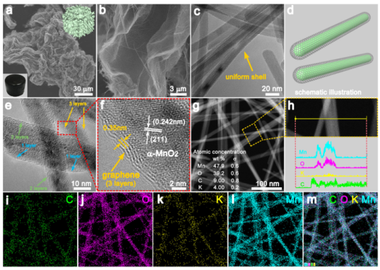 Figure 2. 三維分級的MnO2@GR的形貌。.包括SEM圖,TEM圖,MnO2@GR納米纖維示意圖,HAADF-STEM圖和相應的EDX線性掃描,以及元素分布。