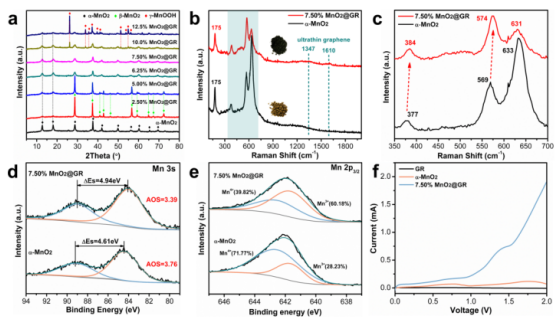 Figure 3.三維分級的MnO2@GR的結構分析。包括XRD圖, Raman譜和XPS光譜,以及在0.1M Bu4NPF6電解質中的CV曲線。