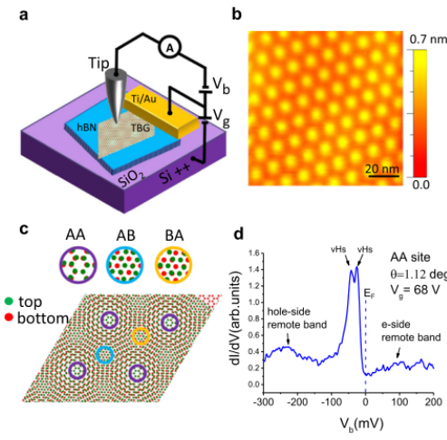 Figure 1. 魔角扭曲雙層石墨烯的掃描隧道顯微鏡/掃描隧道顯微鏡測量。a)掃描隧道顯微鏡設備和測量設置示意圖,b)在300毫伏偏壓和30帕隧道電流下測量的掃描隧道顯微鏡形貌,c)各種堆疊排列的圖示,d)顯示了典型的