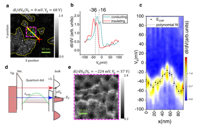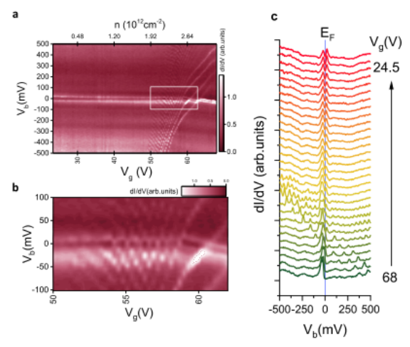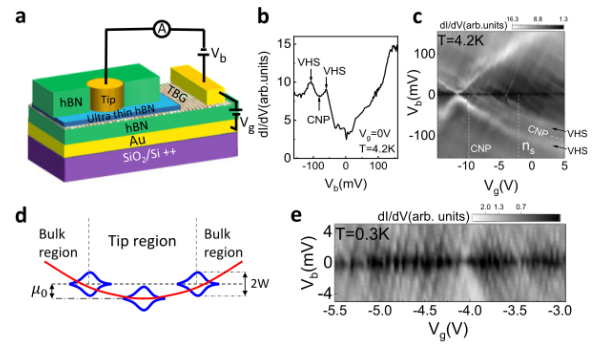 Figure 4.TBG平面隧道器件中的載流子限制。a)平面隧道器件示意圖,b)在0 V背柵電壓下測量的隧道光譜,c)STS柵電壓相關的漫譜,d)電荷中性點位置相關性示意圖,e) 柵電壓相關的高分辨