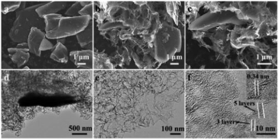 Figure 3.G/AC 的SEM和TEM分析。(a-c)SEM圖像;(d-f)TEM圖以及HRTEM圖。
