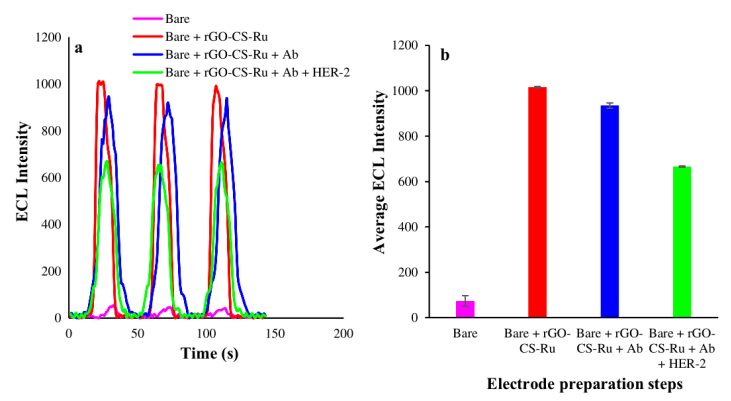 圖2. 電極制備步驟。(a)裸玻碳電極、玻碳+rGO-CS-Ru、玻碳+ rGO-CS-Ru+Ab、玻碳+ rGO-CS-Ru+Ab+HER-2等四種電極的三個連續的ECL信號圖。(b)對應的平均ECL強度的直方圖。