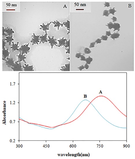 圖1. 使用200μL (A) 和450μL (B)的種子液合成的AuNS@GQDs的TEM圖,以及他們對應的紫外-可見光吸收光譜。