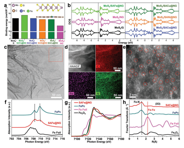 Figure 1. MoS2在石墨烯、NG、SAFe@NG、SACo@NG、SANi@NG 和 SACu@NG 上的 a) 吸附能和 b) DOS。 (a) 中的插圖是SAFe@NG上MoS2吸附配置的側視圖。SAFe@NG的 c) TEM圖像,d) HAADF圖像和EDS映射圖像,以及 e) AC-STEM-ADF圖像,紅色圓圈代表Fe單原子。f) SAFe@NG、Fe箔和FePc的NEXAFS光譜的Fe L-edge。SAFe@NG、Fe箔、FePc和Fe3O4的Fe K-edge g) XANES 光譜和 h) FT-EXAFS 光譜。