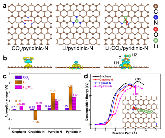 Li-CO2電池作為CO2捕獲和利用技術之一,在碳中和應用方面引起了特別的興趣。然而,用于可逆Li2CO3形成和分解的低成本高效陰極催化劑的設計和制造仍然具有挑戰性。在這里,在理論計算的指導下,CO2被用來激活傳統摻氮石墨烯的催化活性,其中吡啶-N和吡咯-N的總含量很高(72.65%),并且在兩種CO2還原中都有很高的催化活性和演化反應,從而激活Li2CO3形成和分解的可逆轉化。因此,設計的陰極在1200 mA g-1下具有2.13 V的低電壓間隙和長壽命循環穩定性,在500 mA g-1下循環170次后電壓間隙小幅增加0.12 V。我們的工作提出了一種設計具有高活性的無金屬催化劑的方法,可用于激活Li-CO2電池的性能。
