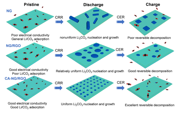 Figure 5. Li-CO2電池中NG、NG/RGO和CA-NG/RGO正極的CRR和CER圖示。