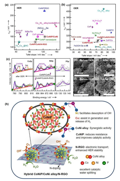 10)下具有低的過(guò)電勢(shì)300 mV。Ni和Co金屬的協(xié)同作用,以及集成半導(dǎo)體磷化物/金屬合金的界面性質(zhì)和MOF衍生碳的電子電導(dǎo)率調(diào)節(jié)了催化劑的性能。此外,雙金屬CoNiP/CoNi合金催化劑散布著N摻雜的石墨烯,形成三元組催化劑,由于三元組催化劑的界面效應(yīng),大的電化學(xué)活性表面積,并從N摻雜石墨烯中增強(qiáng)了的導(dǎo)電性,對(duì)析氫反應(yīng)(η10=150 mV)表現(xiàn)出優(yōu)異的活性和優(yōu)異的耐久性。含碳催化劑在OER(氧化)過(guò)程中的穩(wěn)定性因雜原子摻雜劑的高反應(yīng)性而改變。組裝的CoNiP/CoNi/N-RGO||CoNiP/CoNi水電解槽在10 mAcm-2下可提供 1.76 V 的合理電池電位。因此合成的雙金屬CoNiP/CoNi合金基三元組催化劑表現(xiàn)出優(yōu)異的電催化活性和高耐久性,適用于高效堿性水分裂。