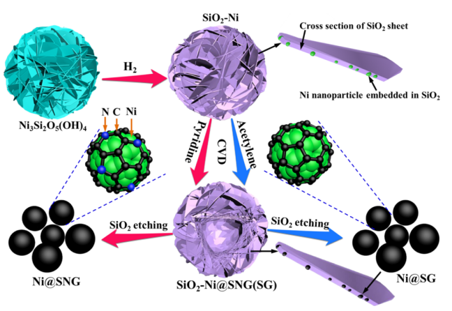 Figure 1. 在SiO2的幫助下,由SG(或單層N摻雜石墨烯)封裝的Ni NPs的大規模制造示意圖