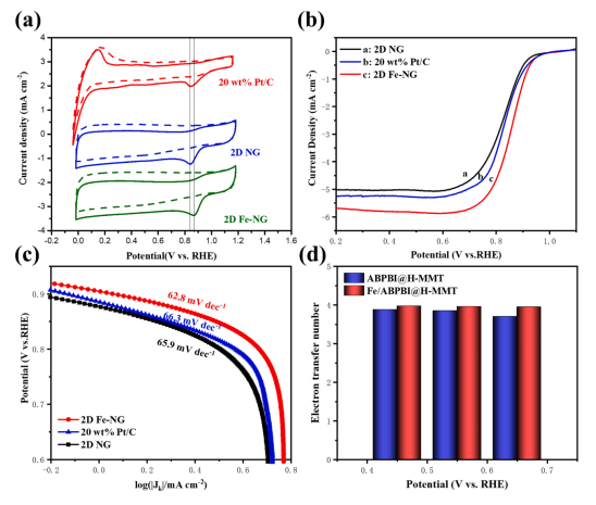 Figure 4. (a) 2D NG、2D Fe-NG 和 20 wt% Pt/C 在 N2 和 O2 飽和的 0.1 M KOH 電解液中的 CV 曲線。(b) 制備的催化劑和商業(yè)20 wt% Pt/C的ORR LSV曲線。(c) 從LSV曲線獲得的所有樣品的 Tafel 斜率圖。 (d) 不同電位下的電子轉(zhuǎn)移數(shù)。