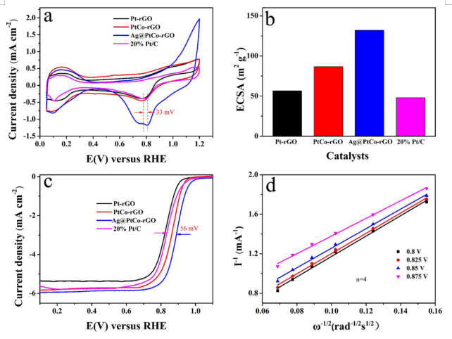 Figure 3. Pt-rGO、PtCo-rGO、Ag@PtCo-rGO 和 20% Pt/C在0.1 M HClO4溶液中測量的 (a) CV、(b) ECSA和 (c) LSV 曲線。(d) Ag@PtCo-rGO在0.8-0.875 V 下的 Koutecky-Levich 圖。