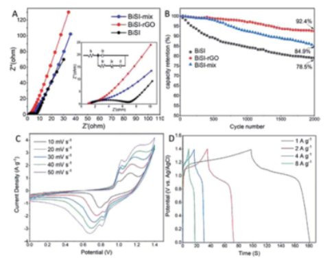 該研究工作由愛丁堡大學Neil Robertson,華中科技大學Yue Hu課題組于2021年發表在J. Mater. Chem. A期刊上。原文:A novel method to synthesize BiSI uniformly coated with rGO by chemical bonding and its application as a supercapacitor electrode material。