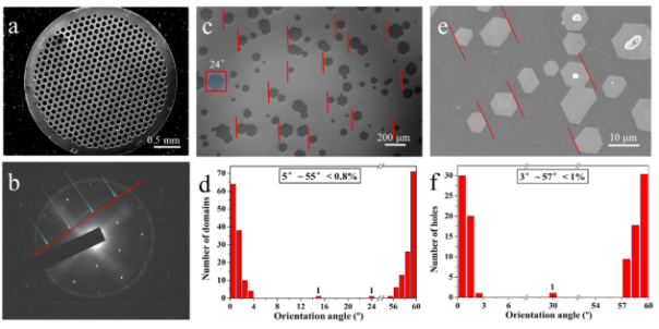 Figure 3. T-Pt基底上生長單晶石墨烯的表征。(a-c)SEM圖和選取衍射圖(ASED)。(d)石墨烯疇的晶體取向統計圖。(e) 氫氣刻蝕后T-Pt表面上連續石墨烯的SEM圖像。(d)蝕刻孔邊緣取向統計圖。