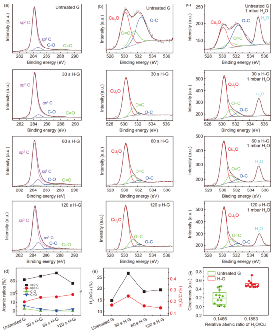 圖3 (a)UHV中的高分辨率碳(C)1s光譜。(b)UHV中的高分辨率氧(O)1s光譜。 (c)在1mbar H2O存在下的高分辨率O 1s光譜。(d)UHV中C 1s的原子比。(e)從計算峰面積的Cu(黑色)和C(紅)和C(紅色)的相應(yīng)原子比。(f)表面清潔與水吸附之間的相關(guān)性,用于未處理的G和60 s H-G。