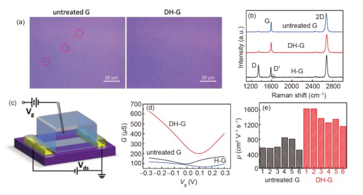 圖4 脫氫后石墨烯的光學(xué)和電性能。 (a)未處理的G和DH-G的光學(xué)顯微鏡圖像。紅色圓圈表示與聚合物殘留物污染的斑點。 (b)60s H-g的拉曼光譜,在350℃下退火1小時后的DH-G,并在Si晶片上未處理的G. 使用2.33eV(532nm)激光激發(fā)來記錄光譜。 (c)在液體門控構(gòu)型制造的GFET的示意圖。 (d)電導(dǎo)(G)作為未處理的G,H-G(60s)和在Si晶片上轉(zhuǎn)印的H-G(60s)和DH-G的柵極電壓(Vg)的函數(shù)。 (e)未處理的G和DH-G的遷移率(μ)值的比較。所有測量都在室溫下在環(huán)境條件下進行。