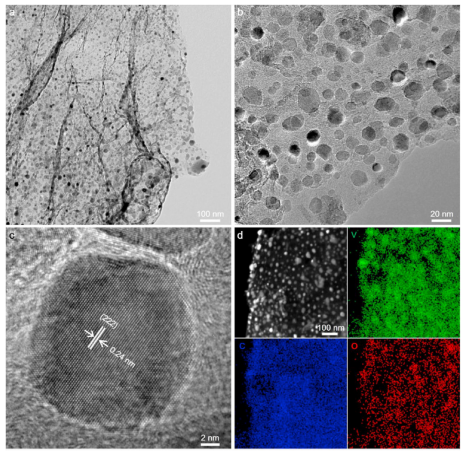 7/rGO電極在390 mW時的TEM表征。(a)和(b)不同放大倍數下的TEM圖。(c)HRTEM圖。(d)C、V和O元素的HAADF-STEM圖和相應的EDS圖。