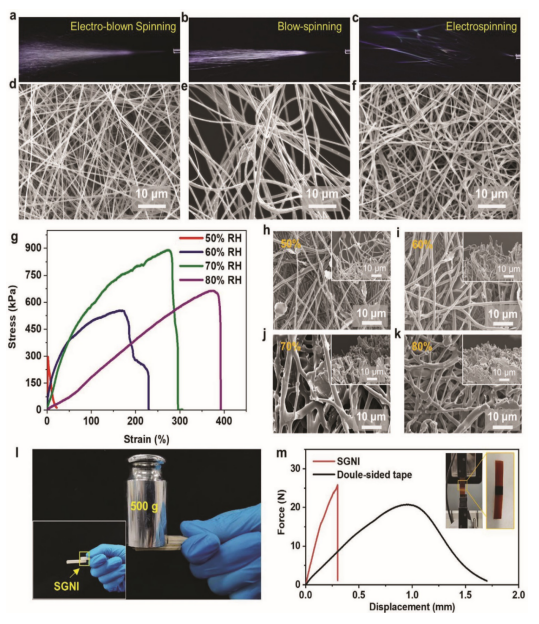 Figure 2. SGNI的紡絲和粘合特性。期間旋轉噴射的快照:(a)電噴紡工藝,(b)吹紡(c)靜電紡。SEM圖:(d)電噴紡纖維,(e)噴紡纖維(f)和靜電紡纖維。(g)SGNI皮膚在不同相對濕度下的應力-應變曲線。(h-k)SGNI皮膚在不同相對濕度下處理后SEM圖,插圖為失敗部分的相應SEM圖。(l)SGNI皮膚粘附的兩條木條可承受500克的重量。(m)SGNI皮膚與3M商用雙面膠帶之間的粘合力比較。