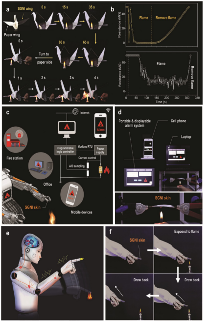 Figure 4. SGNI皮膚的應用。(a)SGNI皮膚保護的纖維素紙的燃燒過程。(b)SGNI皮膚(上內側)和SNI皮膚(下內側)暴露在火中時的敏感性。(c)智能火災報警系統示意圖。(d)照片顯示火焰警報,SGNI粘附在纖維素紙表面,起到防火和火災報警的作用。(e)機器人動作觸發保護系統設計理念。(f)SGNI皮膚用作行為觸發器,以保護假肢免受外部傷害。