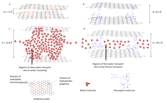 圖 7. (a) 層間距為7.2 Å的干GO膜。 (b)層間距為8.1 Å的干GO膜。 (c)具有膨脹夾層的濕GO膜的納米通道示意圖 11.8 Å,其中水分子聚集在親水域周圍并通過膜緩慢傳輸。 (d)多酚rGO膜,層間距離為10.1 Å,具有低摩擦流和快速水傳輸。