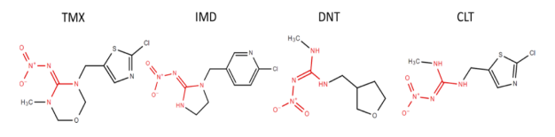 圖 2. 硝基胍官能團以紅色突出顯示的不同新煙堿類化合物的化學結構。