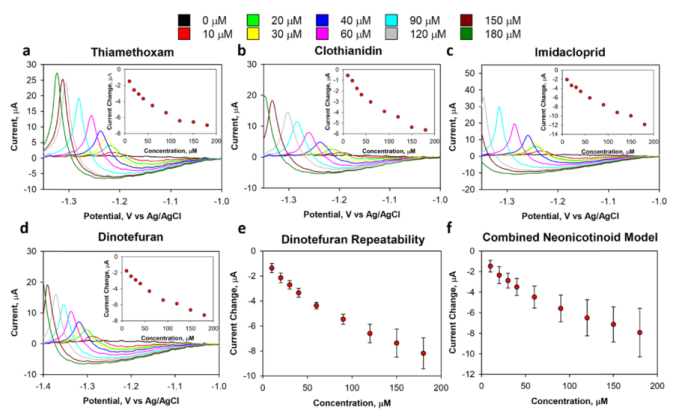 圖3. (a)噻蟲嗪(TMX)、(b)噻蟲胺(CLO)、(c)吡蟲啉(IMD)、(d)呋蟲胺(DNT)、(e)呋蟲胺重復性和(f)新煙堿類化合物組合模型的方波伏安圖和插入校準圖。