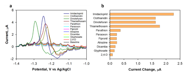 圖 4. 干擾數據包括 (a)方波伏安圖和 (b)使用40μM濃度的每種農藥與不含農藥的磷酸鹽緩沖鹽水基線測量的電流變化比較。